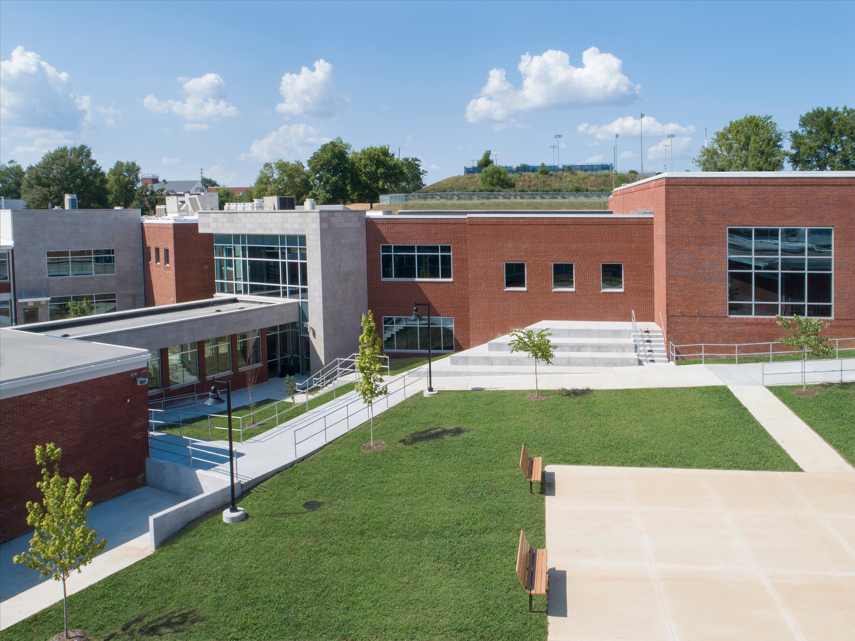In a campus setting, where multiple buildings talk to each other, designing thoughtful outdoor spaces in between can help create a cohesive environment. At John Overton High School, three outdoor courtyards were created by relocating the existing library and cafeteria. This not only gave students more green space to gather and socialize in safe areas, but also acted as a connector for the school’s multiple buildings.