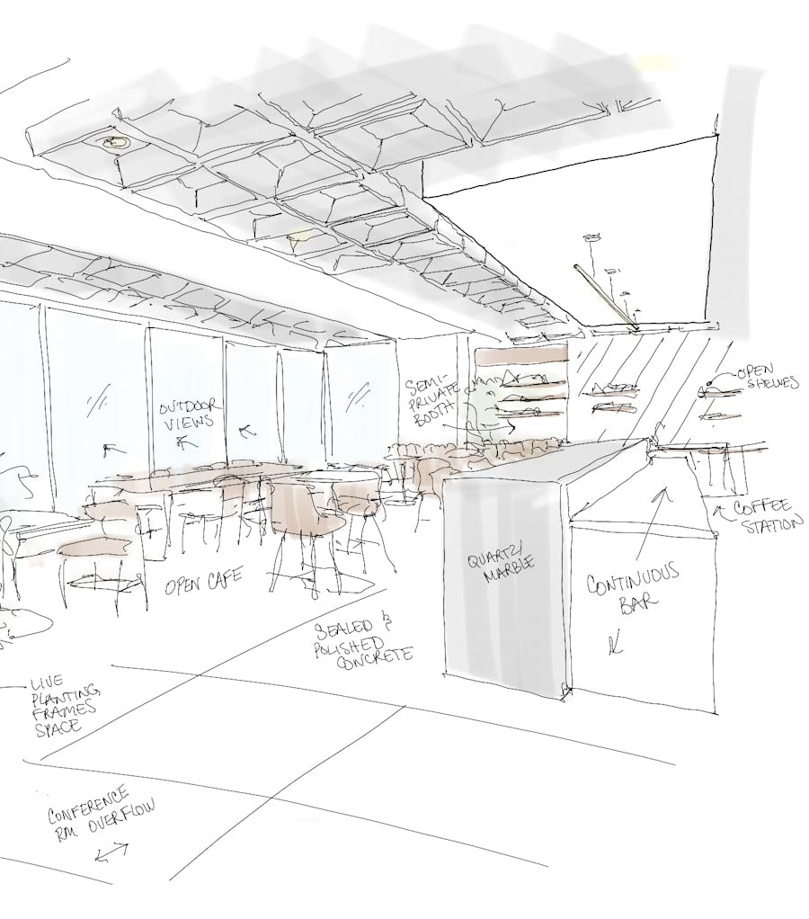 When you walk in the main entrance, the café is located just on the other side of a large quartz wall, which separates it from the reception desk. This was intentional, making it the first stop when people arrive for the day to grab a cup of coffee or breakfast. It's typically the last stop, too, whether for an afternoon happy hour or to snag a snack for the way home. It has ample natural light and provides an amazing view of the development below.