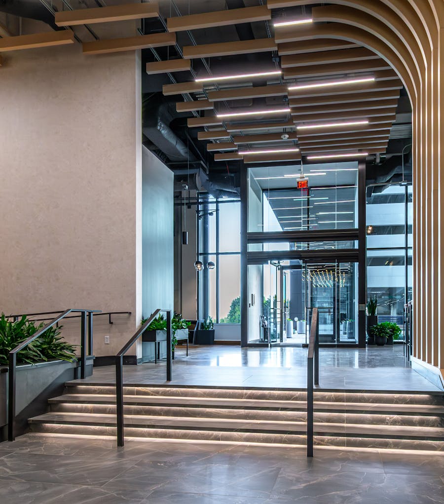 Block E is comprised of four buildings: a nine-story office over retail, 915-space parking deck, 23,600-square-foot liner building, and a bridge connector. The high-rise office is the tallest in the complex and the first concrete-framed office building in the Cool Springs market. The lobby design was thoughtful and intentional, and the pass-through connects the main street side to the internal building, allowing patrons to go straight from parking to retail instead of having to walk around the building. Thoughtful consideration into lighting and biophilia was put into the public lobby spaces, and amenities include large conference rooms and fitness facilities.
