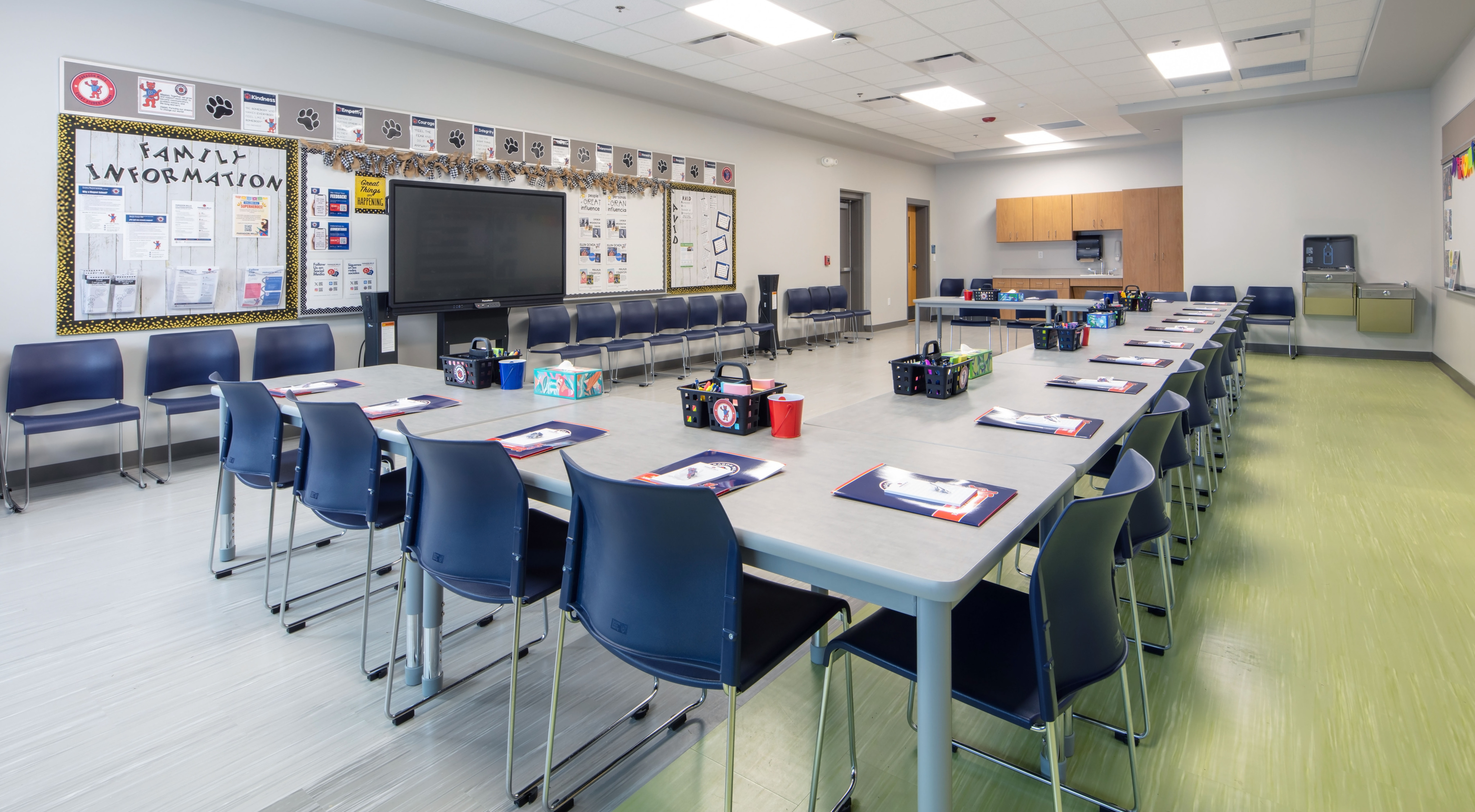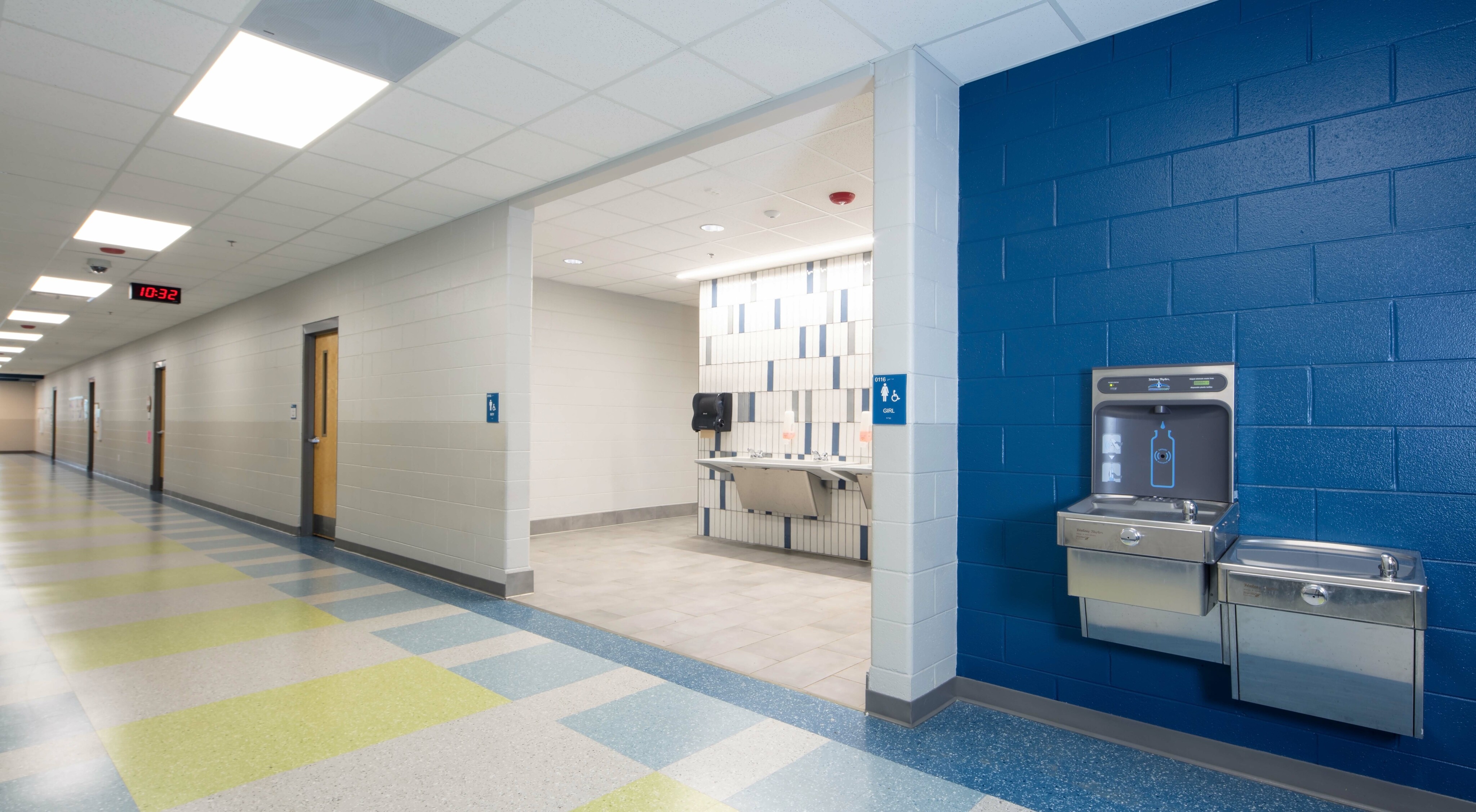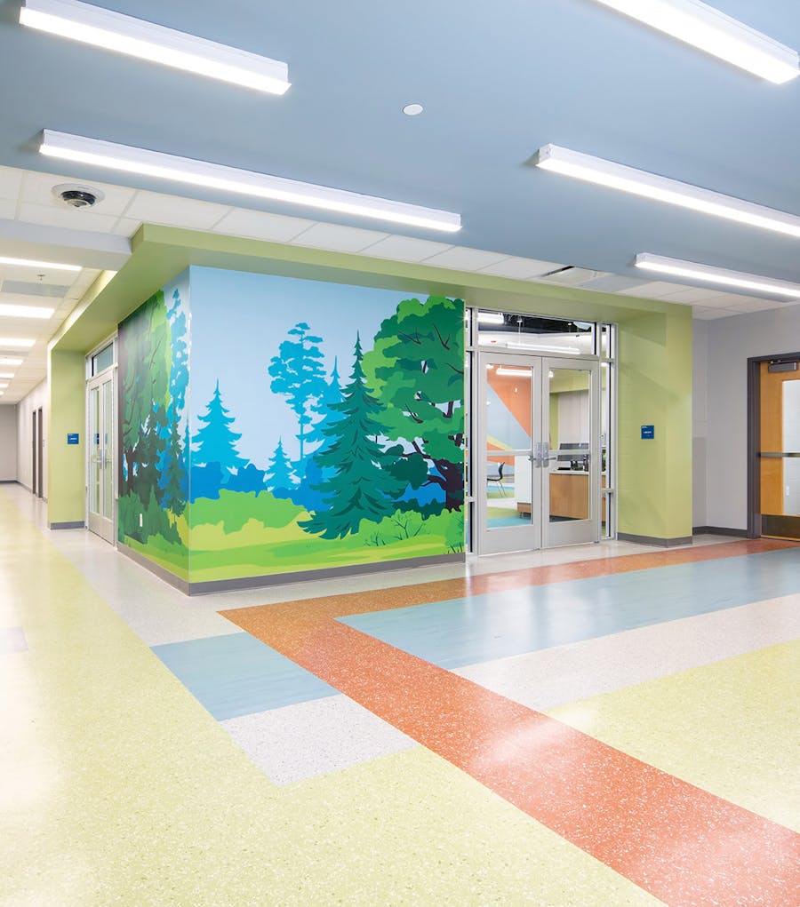 The demographic of Paragon Mills’s student body is predominantly ethnic. About 80% don’t speak English as their first language. We wanted to honor the different cultures through the interior design, and created a “Welcome” mural in one of the hallways that features all 12 main languages spoken. Colors throughout were bright and playful, and we included different colored tiles on the floors that helped teachers and students have visual markers to stand in line.