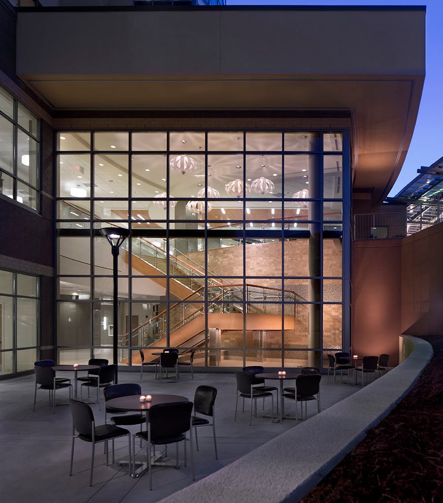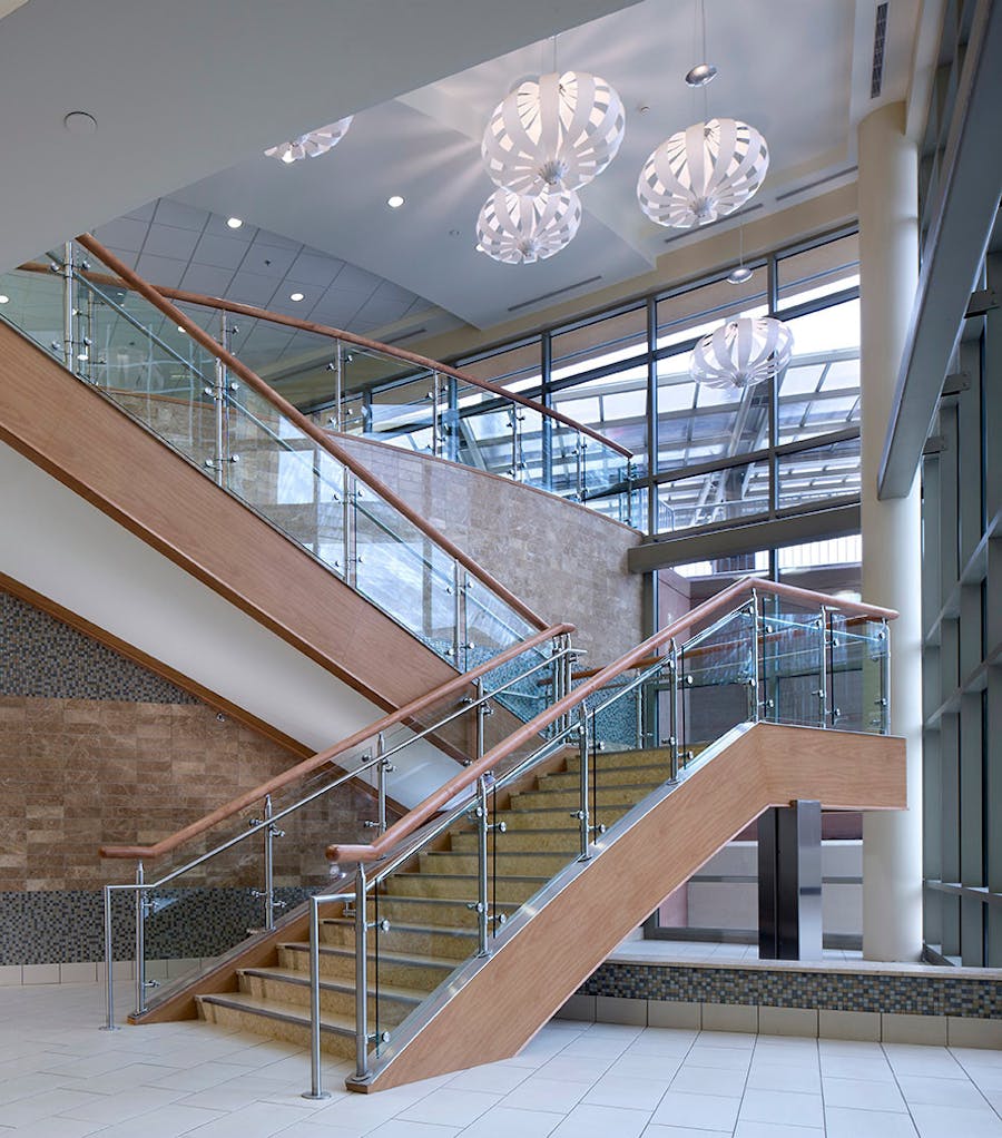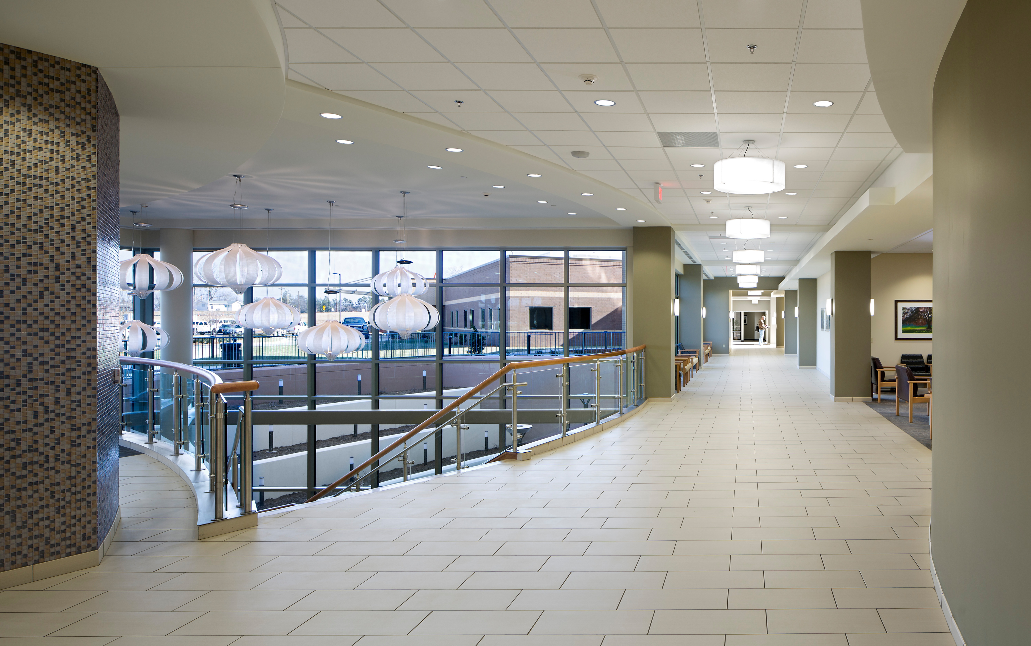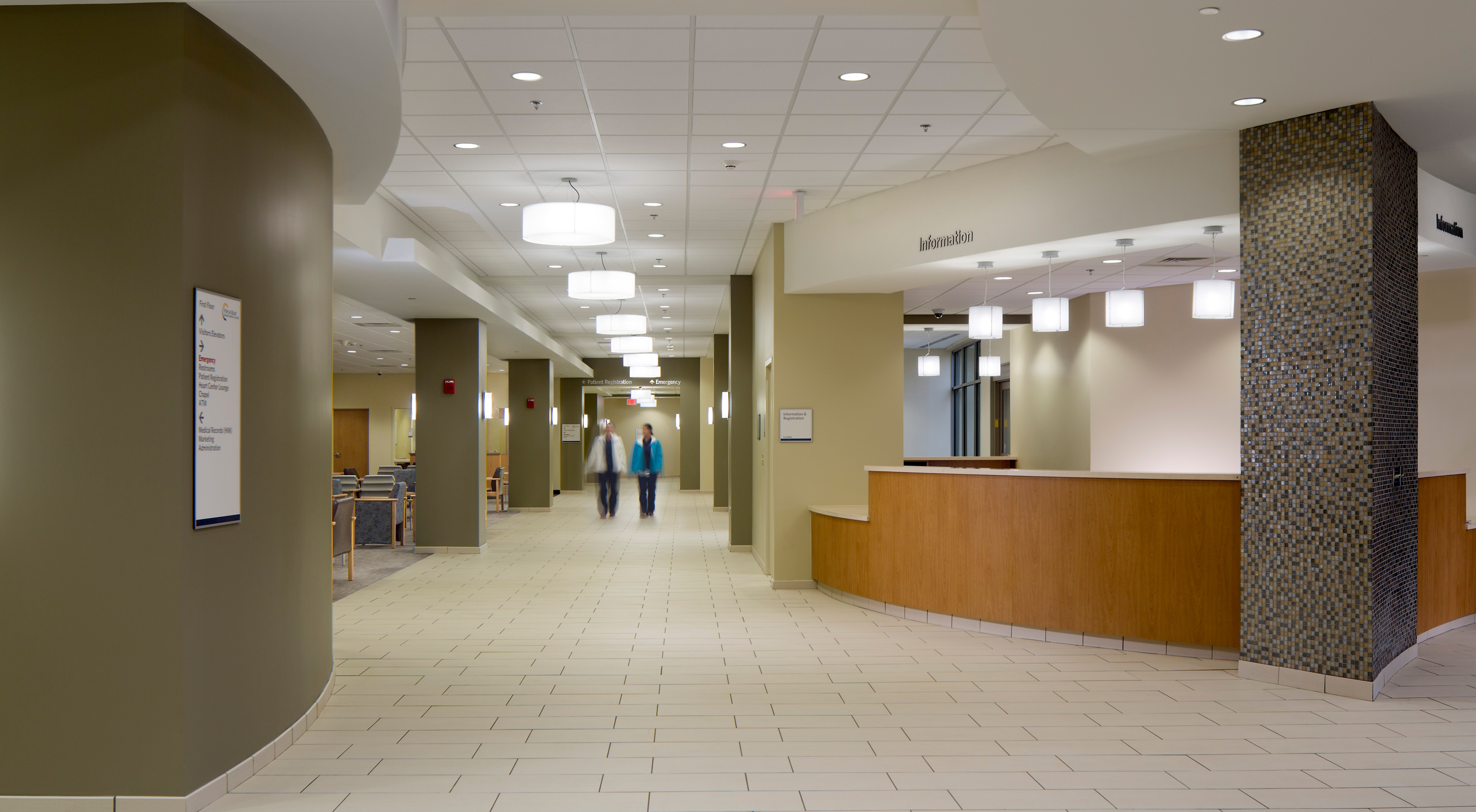 The building itself includes a total of eight stories with an additional mechanical penthouse floor. The main entrance welcomes visitors and patients with a monumental staircase that leads to the ground-level dining area. An emergency department, outpatient surgery, surgical services, post-anesthesia care unit, and imaging are located on the first floor, while subsequent floors include operating rooms, a hybrid operating suite, an intensive care unit, women’s center, and private patient rooms.