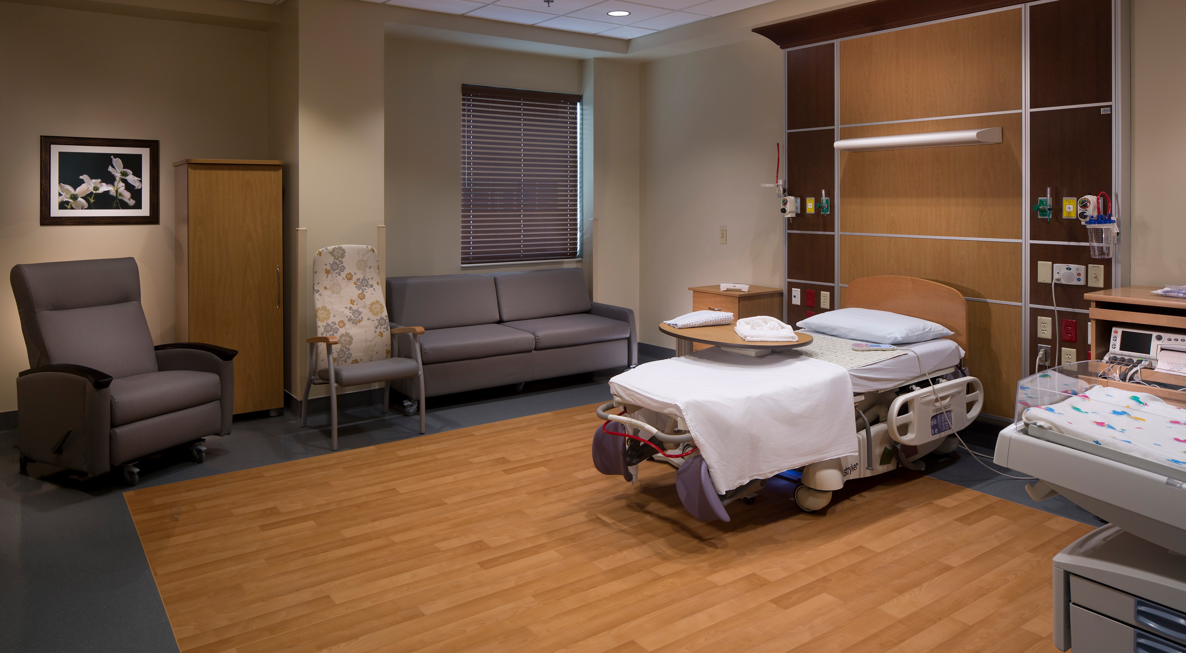 Adjustable acuity patient rooms located on the second floor allow the hospital to be flexible in the level of care, switching between intensive and critical unit functions without having to move patients to different rooms.