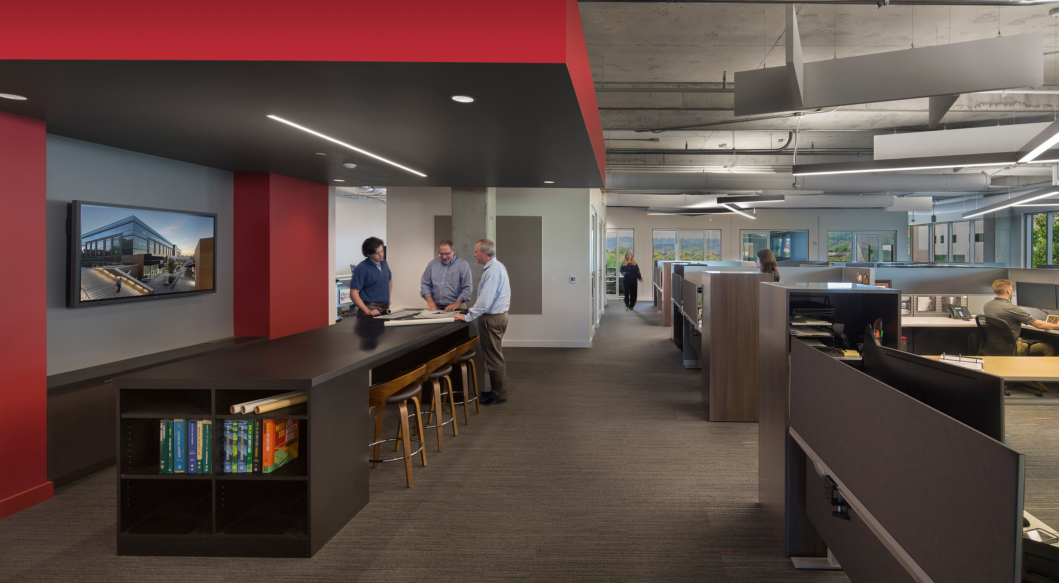 At the heart of the office, a large, open workspace promotes teamwork, collaboration, and the exchange of ideas central to TMP’s design philosophy. Bright pops of red throughout emphasize the brand.
